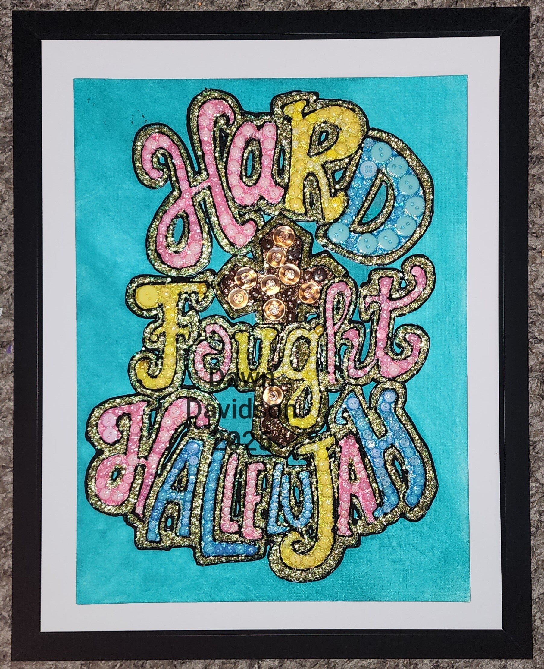 This unique button art is created on a 9 x 12 canvas panel and framed in an 11 x 14 frame with plexiglass.